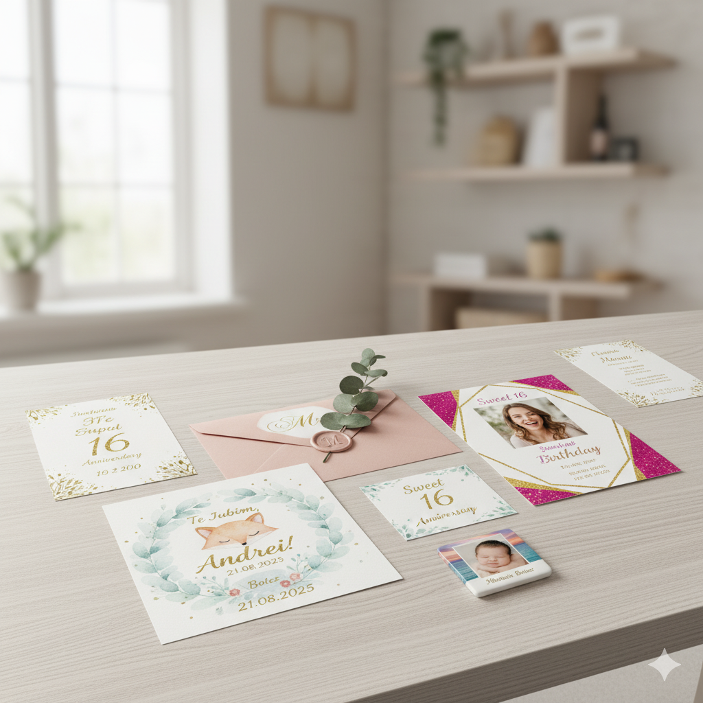 O invitație este mai mult decât o dată și o adresă – este prima emoție pe care o oferi oaspeților tăi. Echipa noastră este dedicată transformării viziunii tale în creații tipărite elegante și unice, perfect adaptate fiecărui moment special din viața ta.